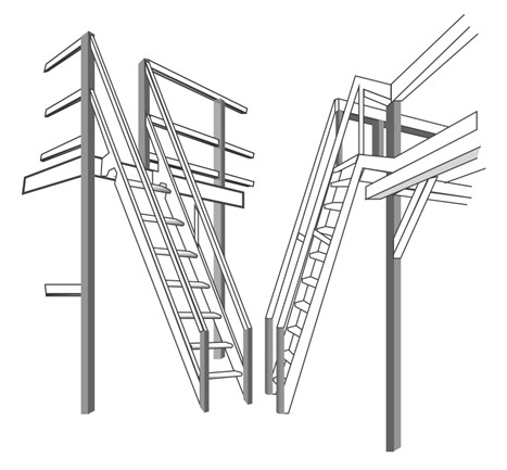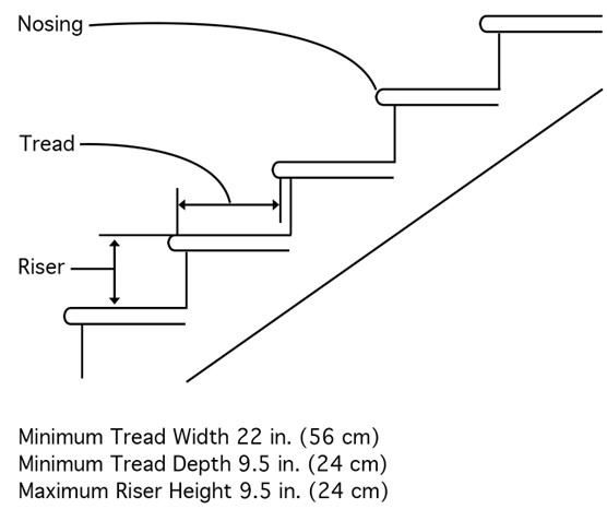 Stairway (stairs) means risers and treads that connect one level with another, and includes any landings and platforms in between those levels. Stairways include standard, spiral, alternating tread-type, and ship stairs.