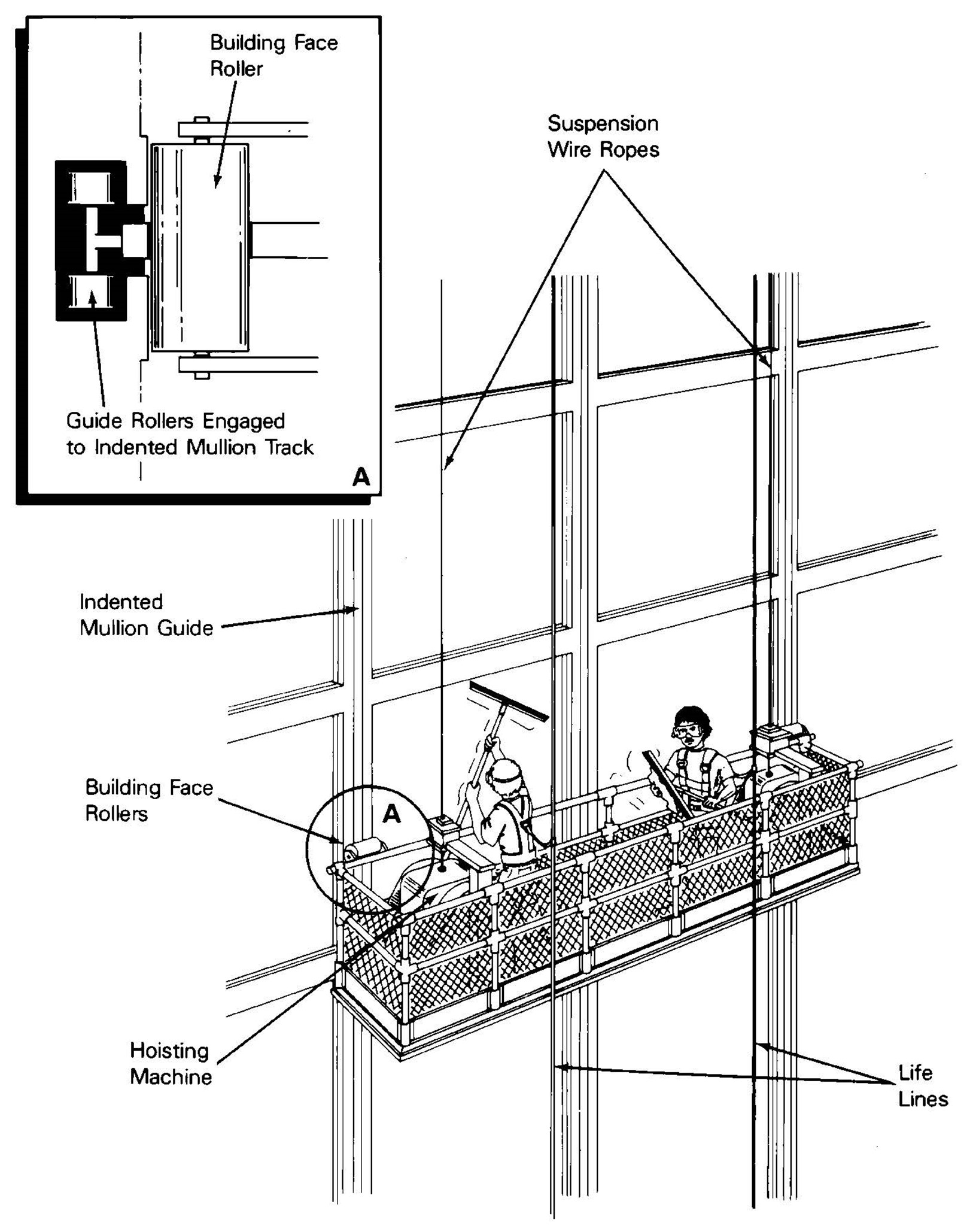 Building face roller means a rotating cylindrical member designed to ride on the face of the building wall to prevent the platform from abrading the face of the building and to assist in stabilizing the platform.