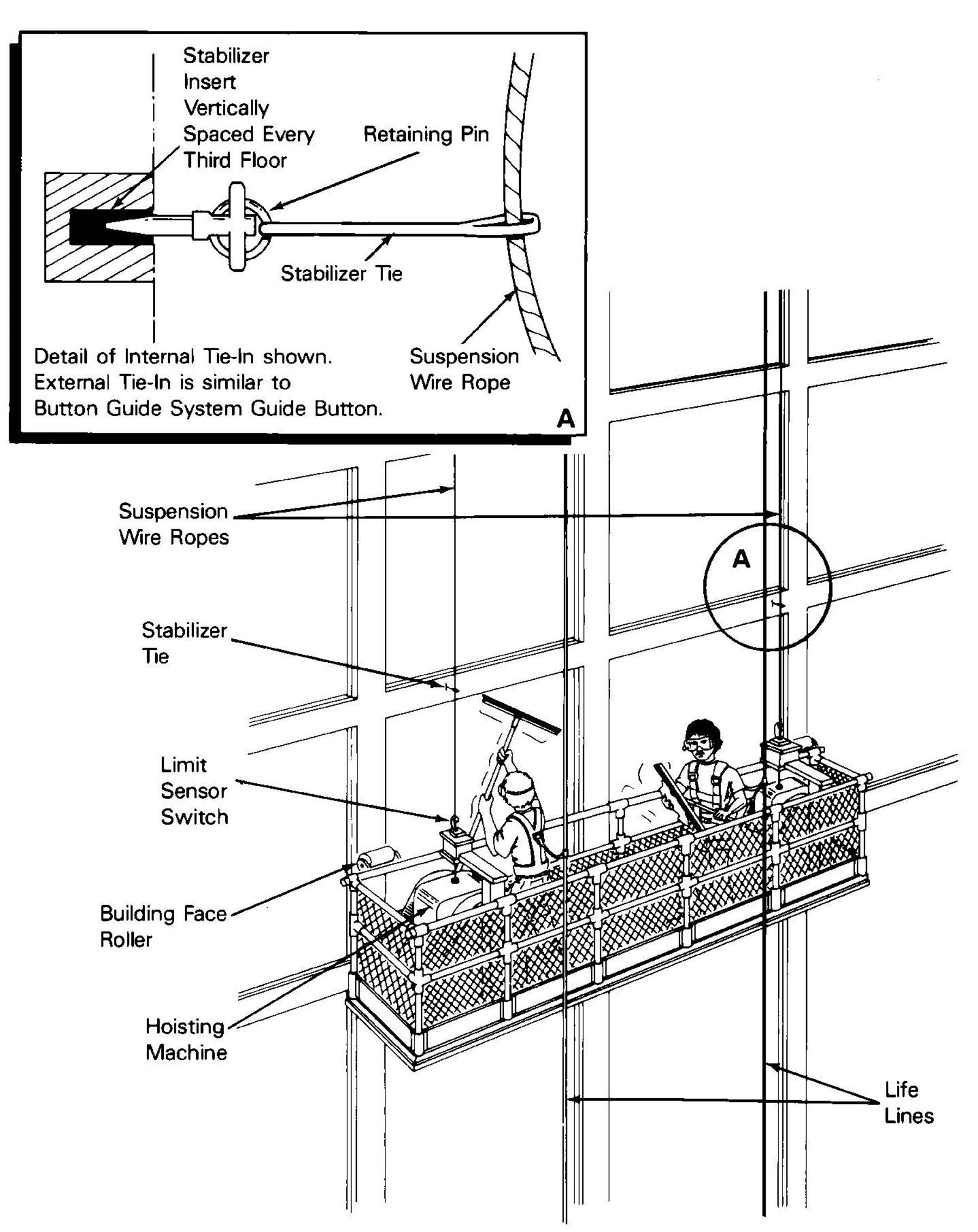 Intermittent stabilization means a method of platform stabilization in which the angulated suspension wire rope(s) are secured to regularly spaced building anchors.