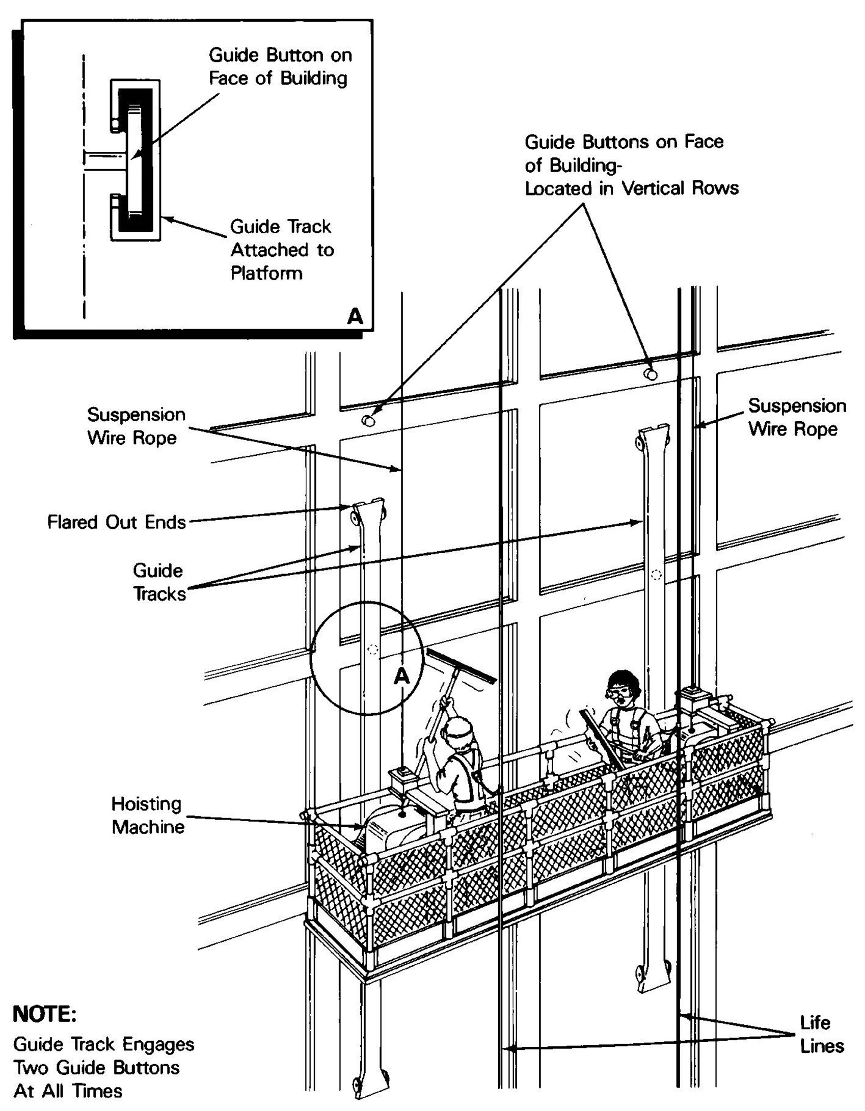 Guide button means a building face anchor designed to engage a guide track mounted on a platform.
