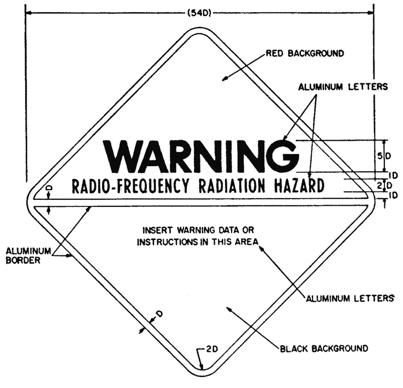 1910.97 (a)(3)(i) The warning symbol for radio frequency radiation hazards shall consist of a red isosceles triangle above an inverted black isosceles triangle, separated and outlined by an aluminum color border. The words "Warning – Radio-Frequency Radiation Hazard" shall appear in the upper triangle. See Figure G-11.
