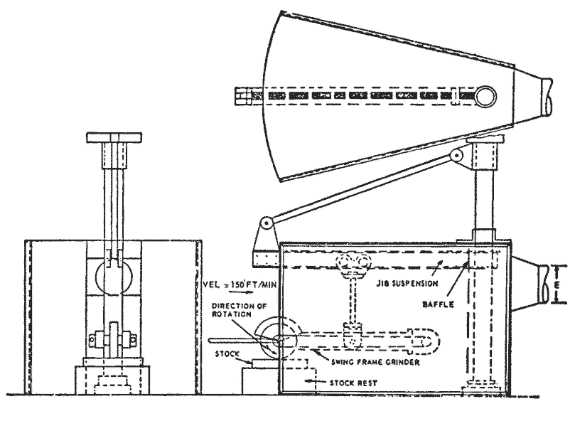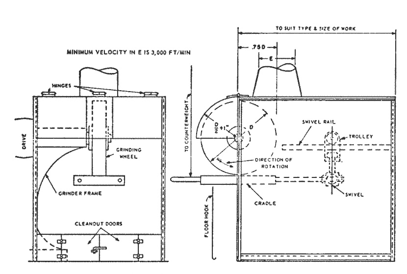 Blasting cabinet. An enclosure where the operator stands outside and operates the blasting nozzle through an opening or openings in the enclosure.